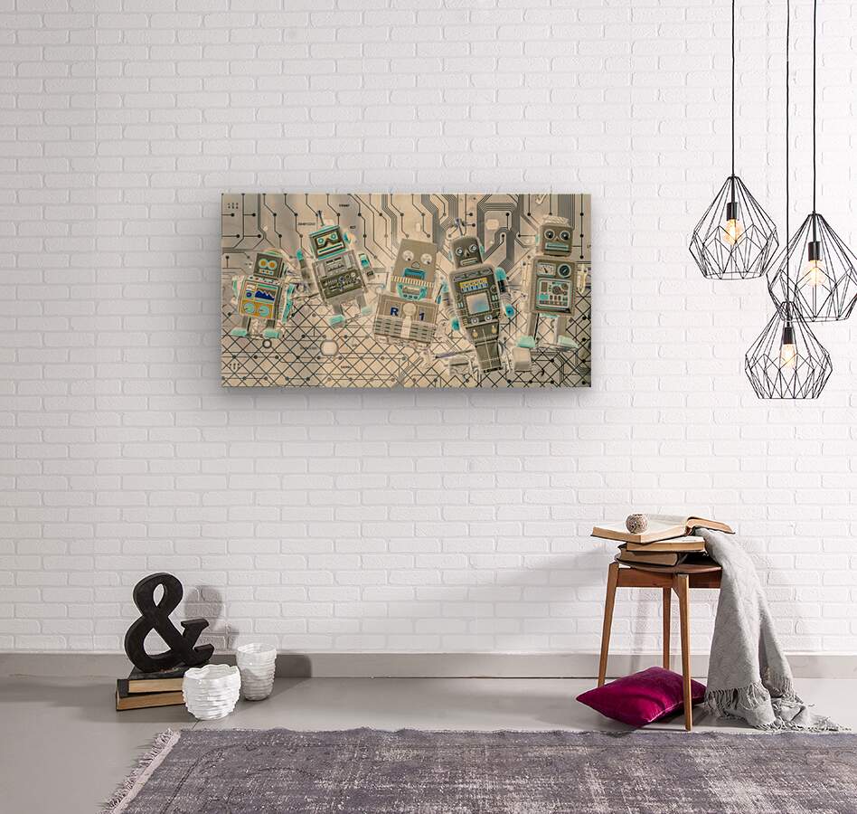 A visual interface of digital toy robots on a board of artificial computer circuitry. Wired intelligence