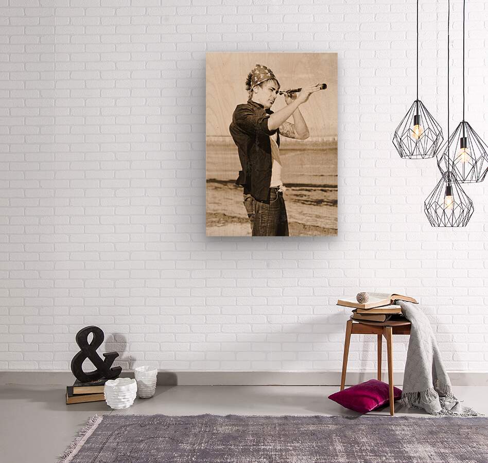 Textured Grungy Portrait Of A Pirate Looking Through A Old-Fashioned Optical Telescope Spying Into The Horizon Of Future Dreams