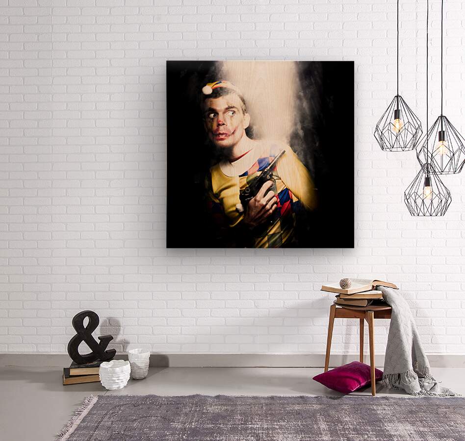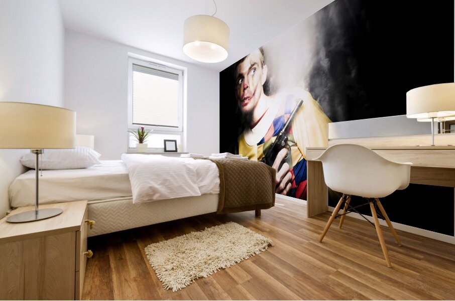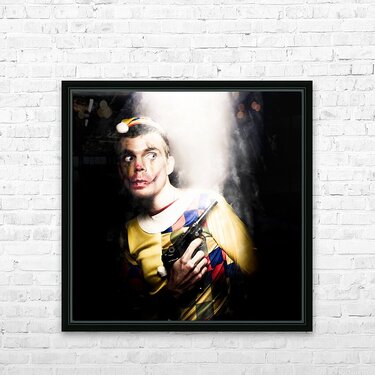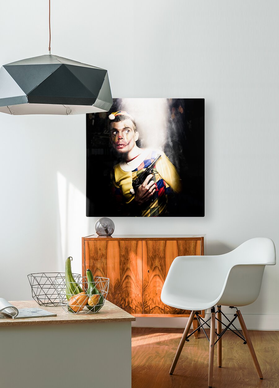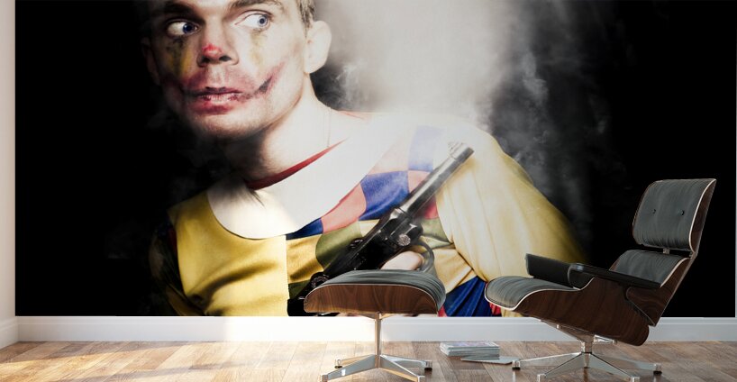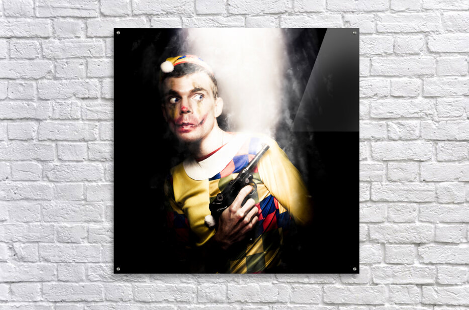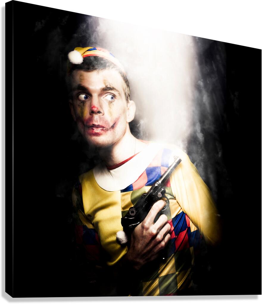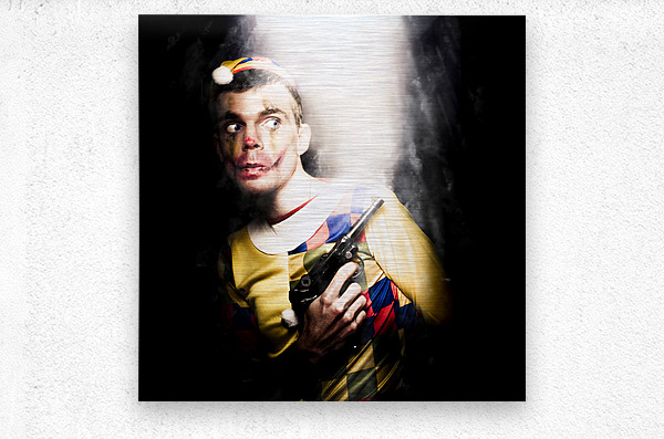 ABOUT THIS ARTWORK: SCARY CLOWN STANDING IN SHADOWS WITH SMOKING GUN