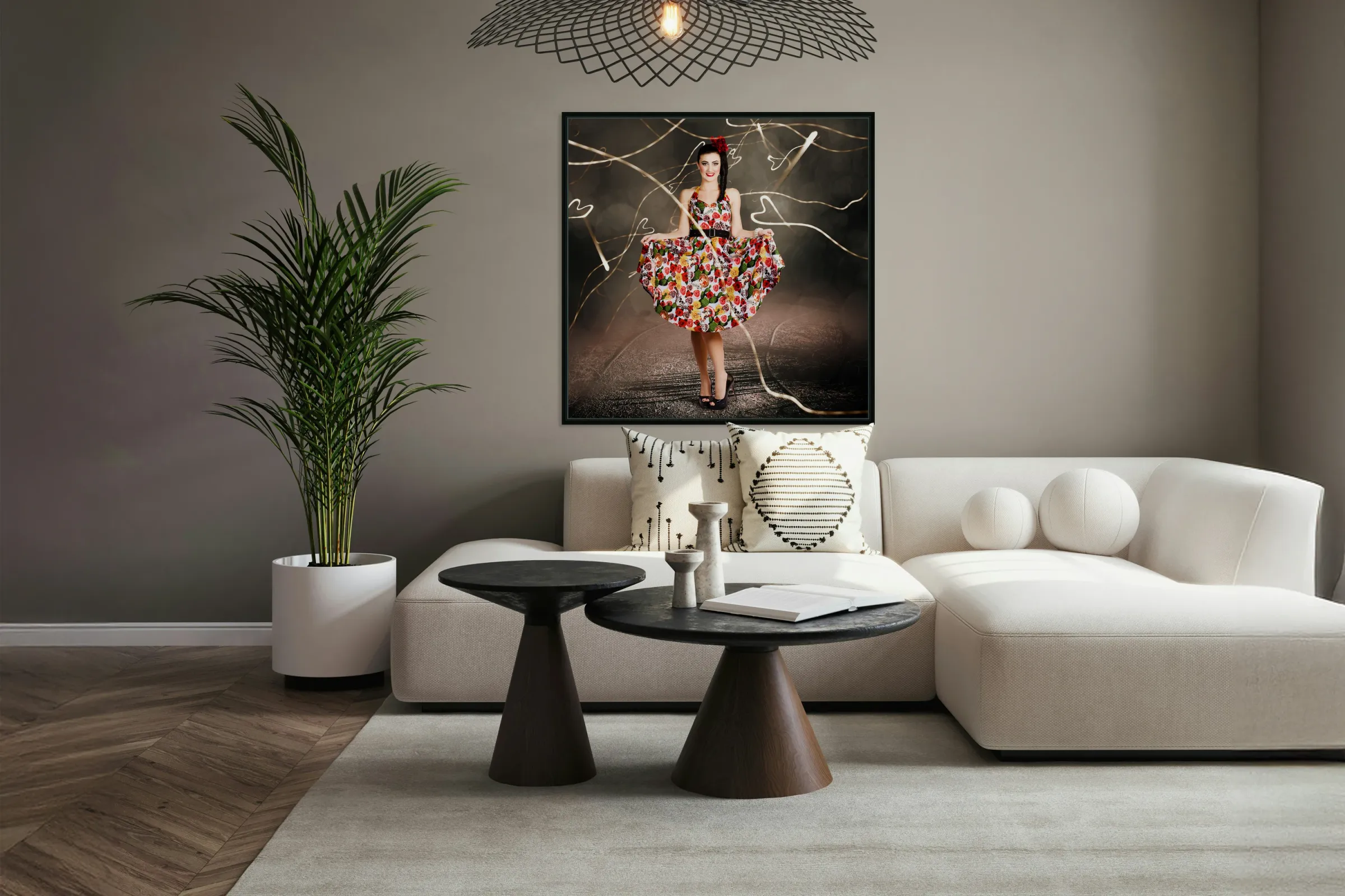 Get this artwork "Woman dancing in colorful floral dress outdoor" in a framed print.
