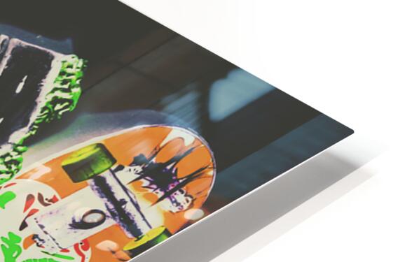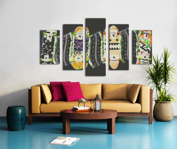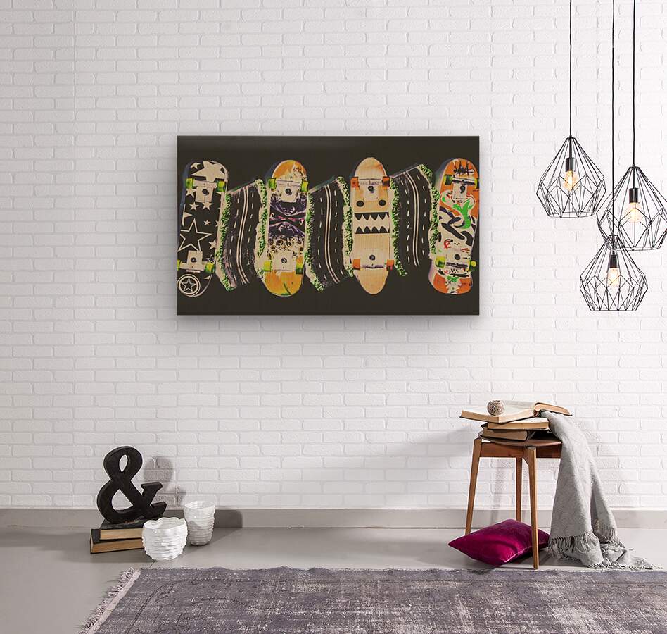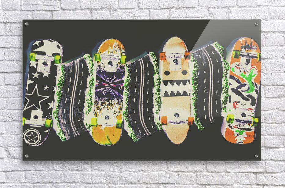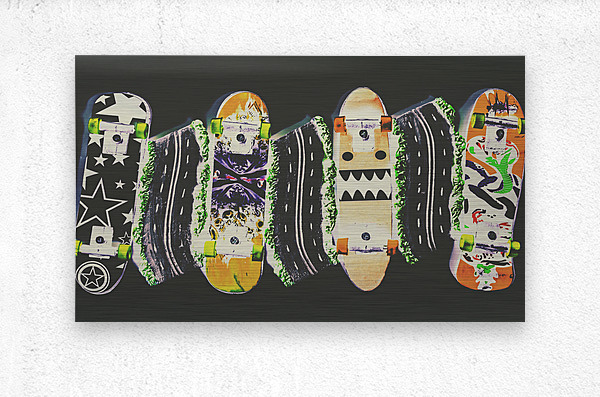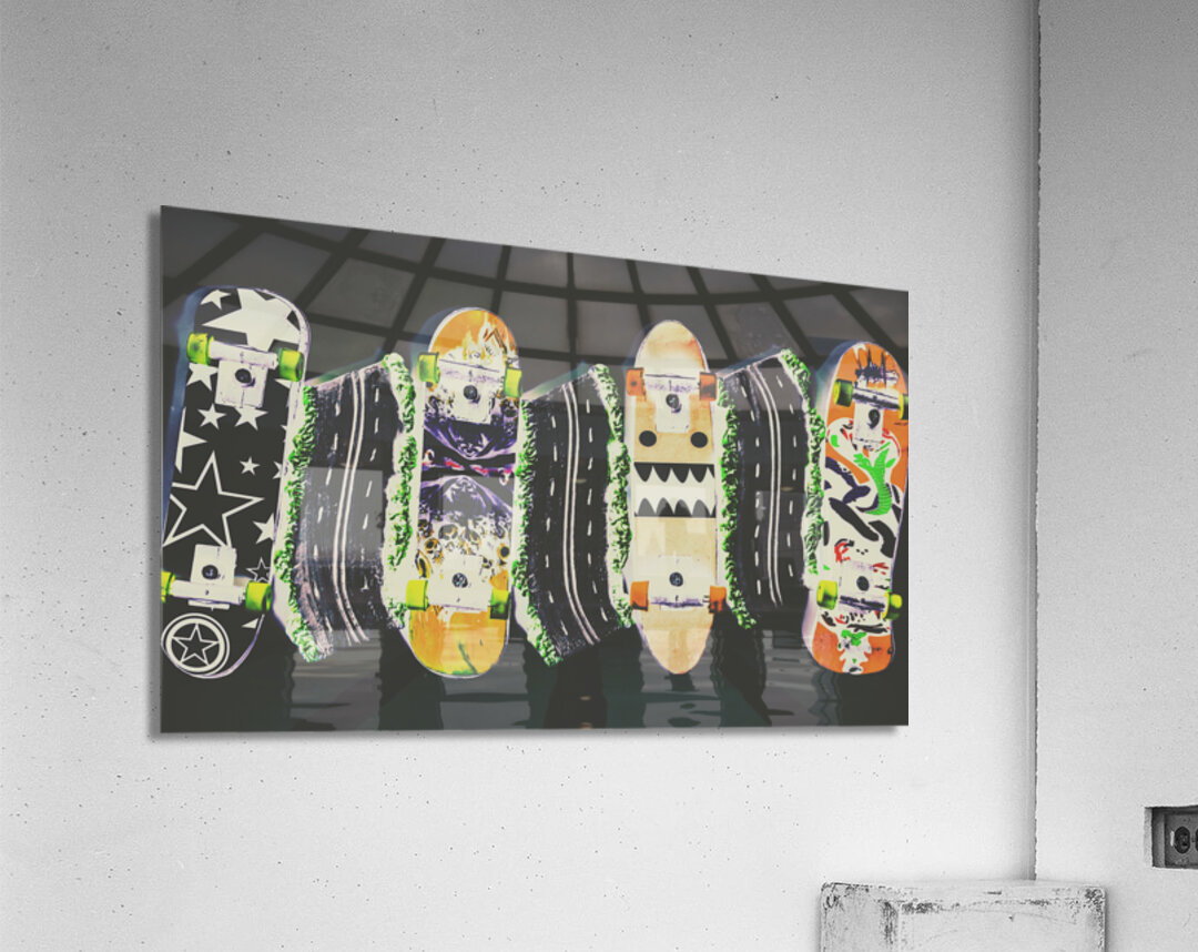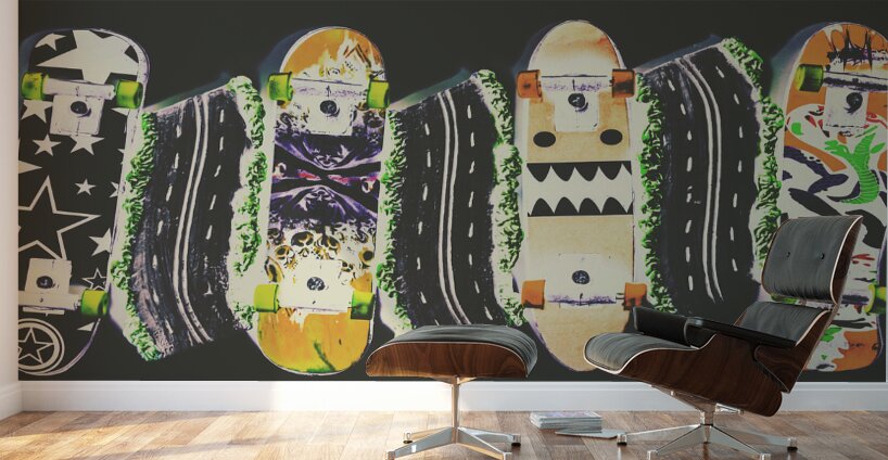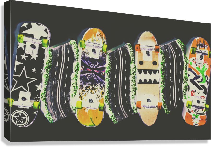Horizontal toned pop art culture on a decking of skateboards of miniature motorways. Freestyle freeway