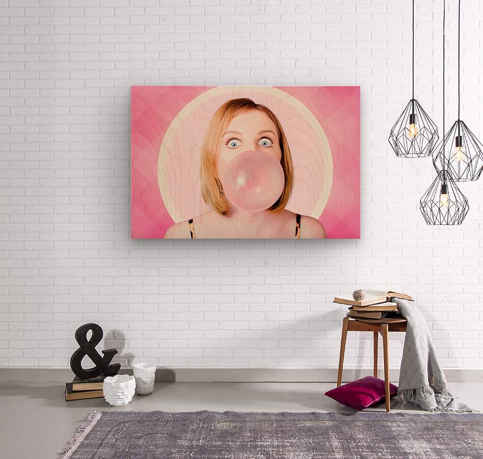 ABOUT THIS ARTWORK: 70S PIN-UP GIRL BLOWING PINK BUBBLE GUM BALL