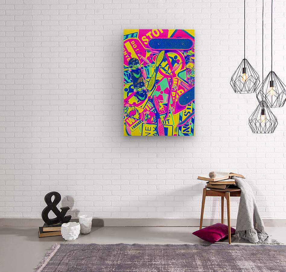Retro poster art in a busy abstract skateboarding still of youth culture and eighties grunge neon signs. Decked out