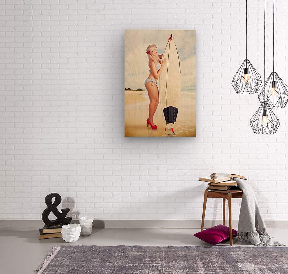 ABOUT THIS ARTWORK: SEXY SIXTIES PINUP SURFER GIRL AT VINTAGE BEACH