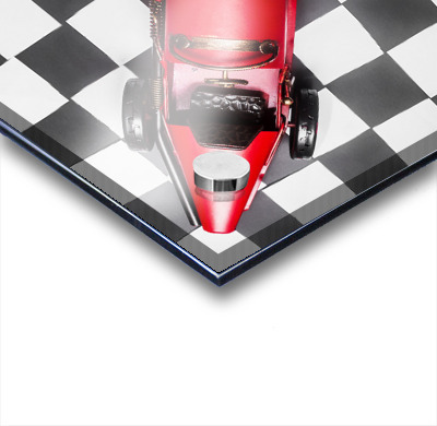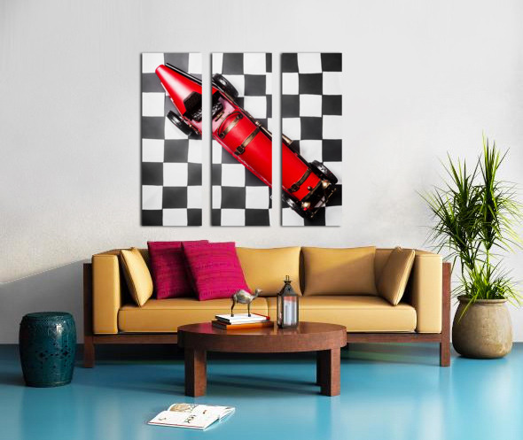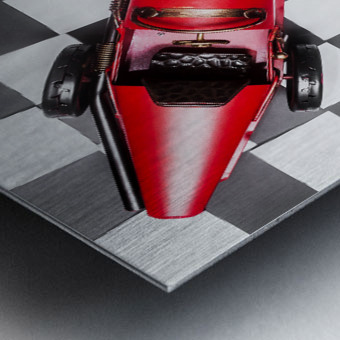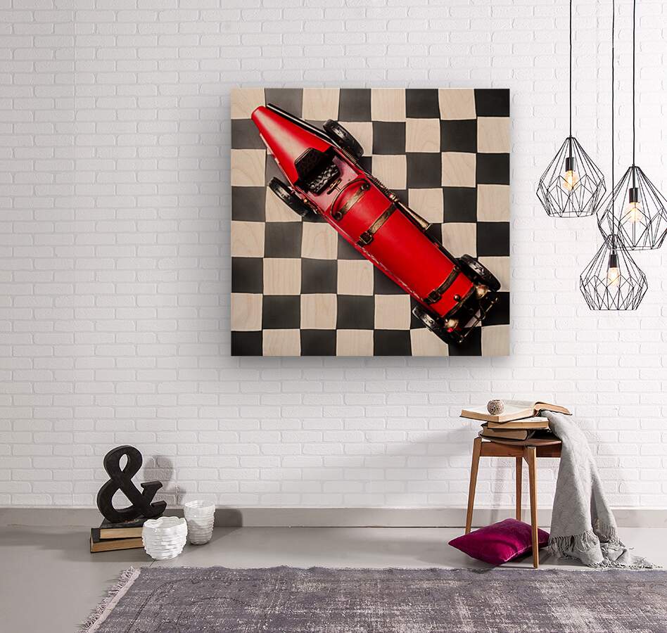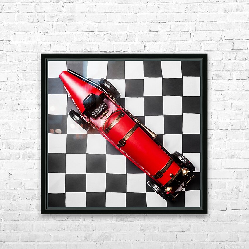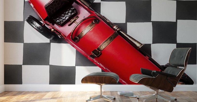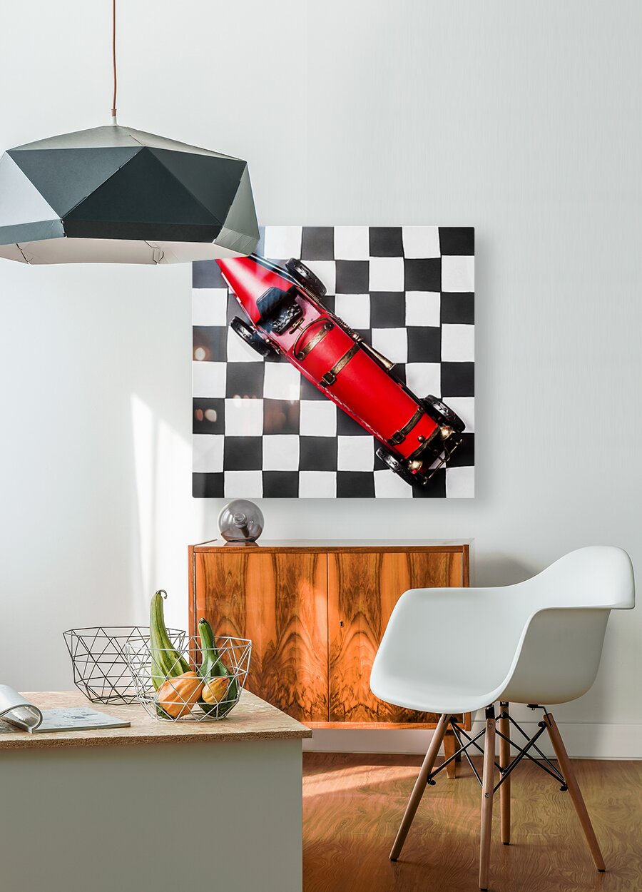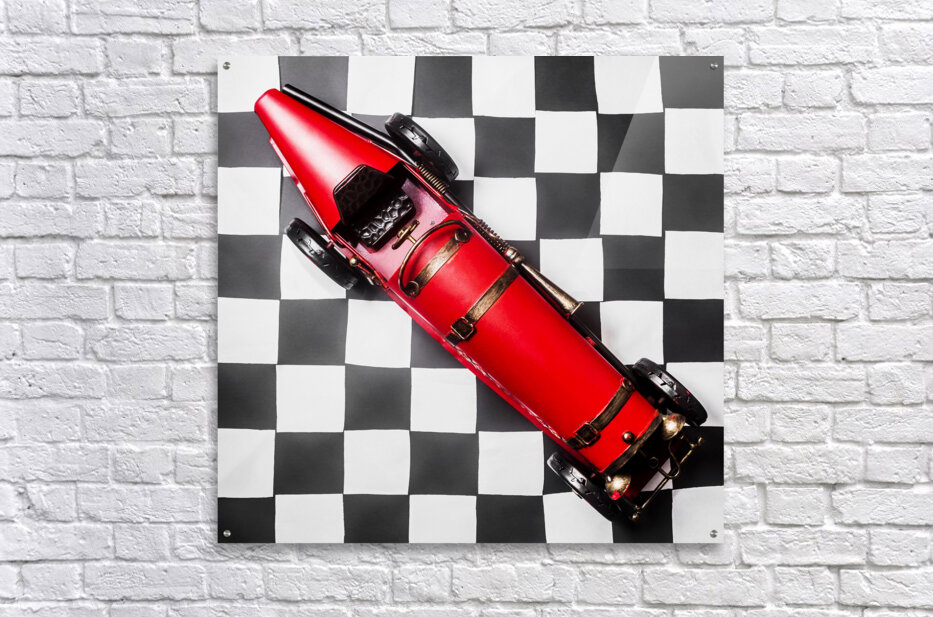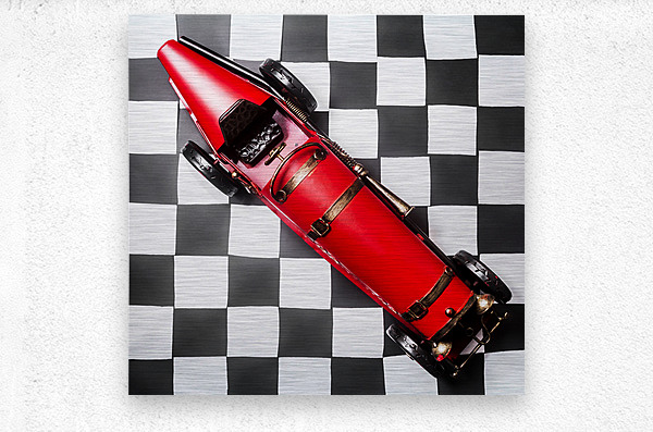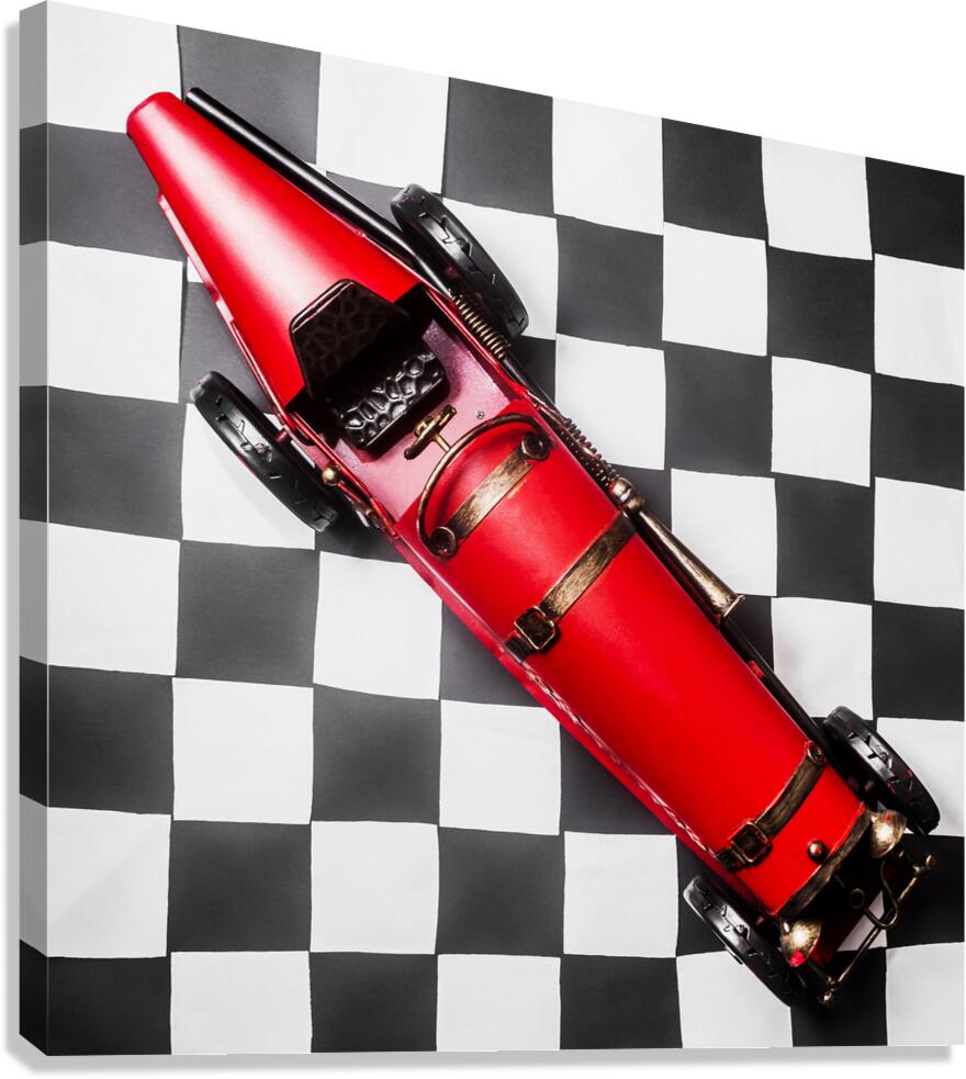 Racing car art on a speedway of vintage victory with historic racecar on checkered flag. For the win