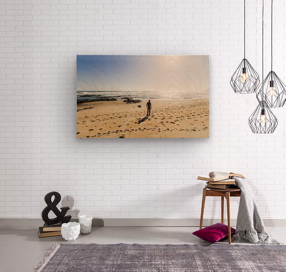 Coastal seascape of a faraway travelling man finding peace on a sunset beach. The lone explorer