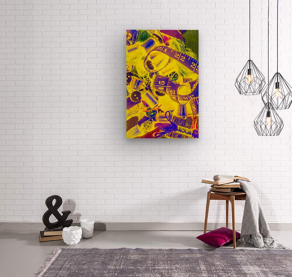 Creative pop art composition on a mix of intricate haberdashery tools in retro abstraction. Crafting colours