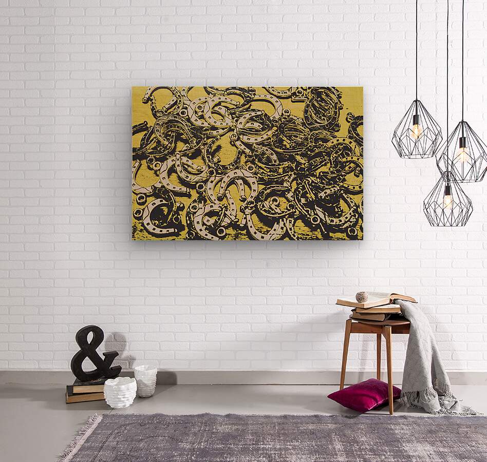 Farmstead still life on a scattering of silver horse shoes on yellow wooden background. Country shine