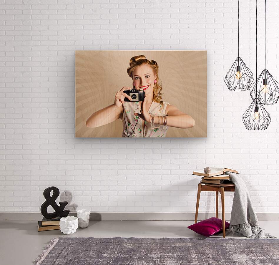 ABOUT THIS ARTWORK: BEAUTIFUL WOMAN PHOTOGRAPHER HOLDING RETRO CAMERA