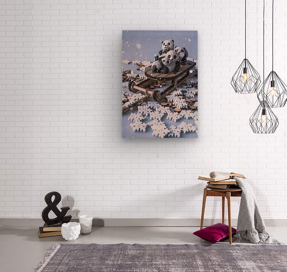 Winter dreams as fanciful panda figurines take sled on snowflakes and frost