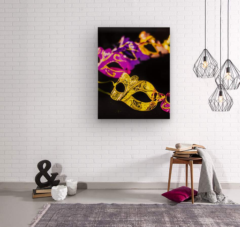 A masquerade of masks captured in a still of entertaining delights with glitz glitter and glam on black background