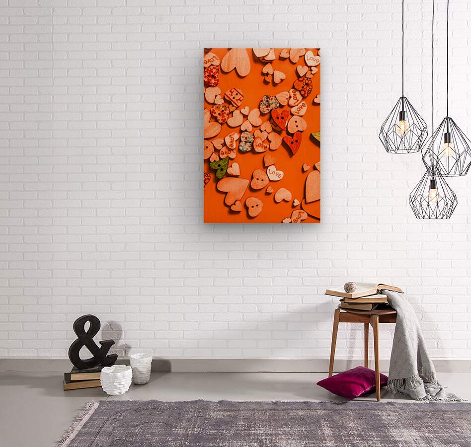 A gathering of hearts mingling and mixing in abstract art on orange background