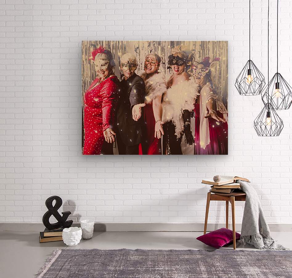 A group of friends celebrate in style donning masks and festive attire. The joyful expressions and glittering decor create a celebratory atmosphere