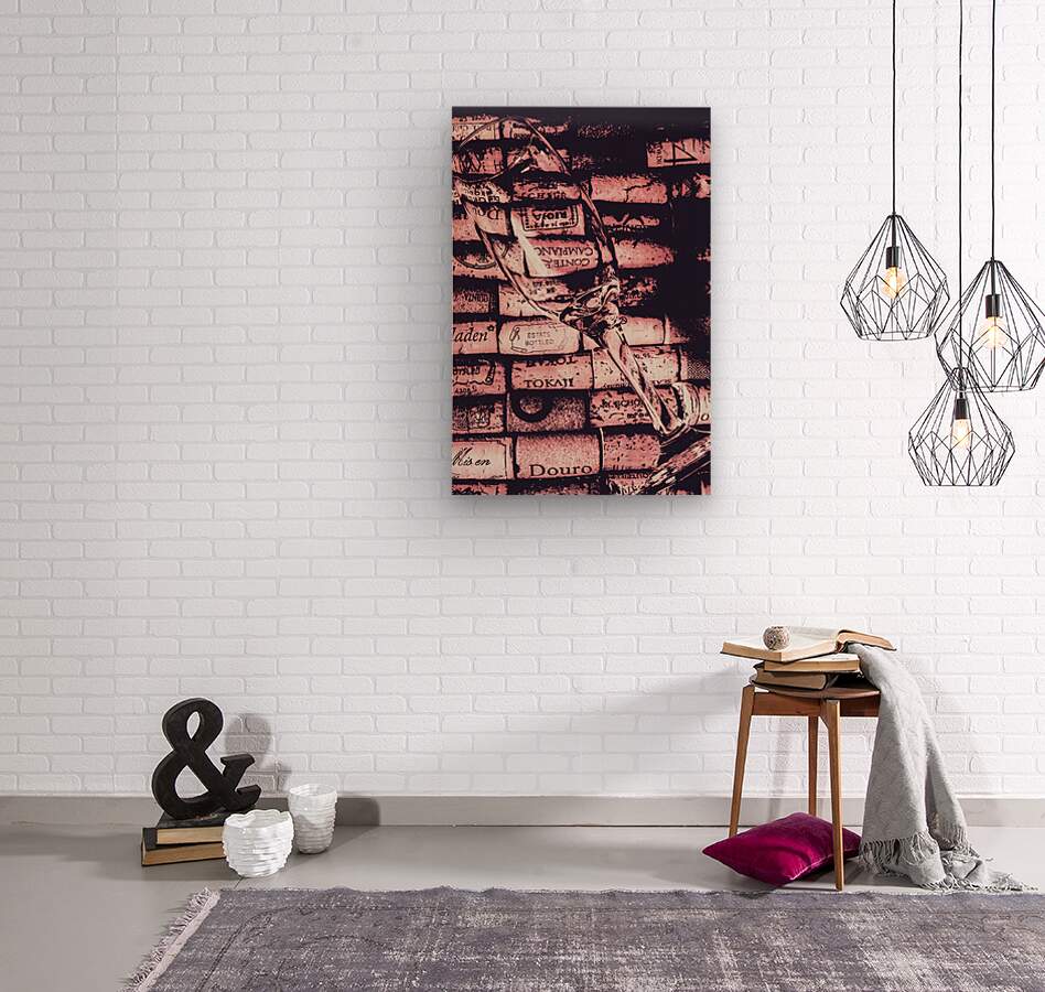 A delicate glass is placed on a vibrant array of wine corks showcasing a blend of textures and colors in an artistic display.