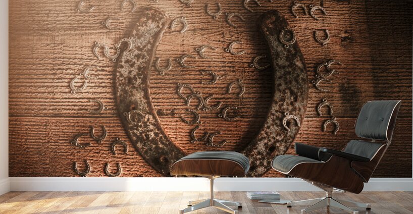 A weathered horseshoe rests on rustic wood surrounded by scattered horse nails evoking equestrian history