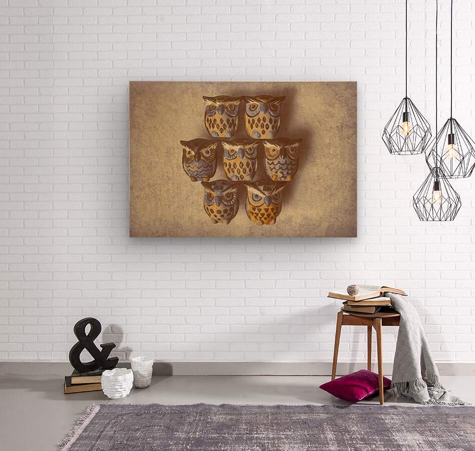 An old owlnate artwork on painted pottery owls crafted in sets of seven