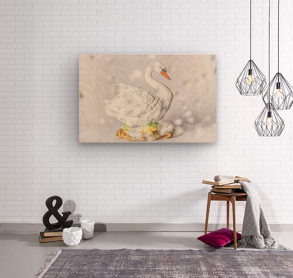 A white swan figurine obscured by a glass pane of water droplets surrounded by soft light in serenity and grace