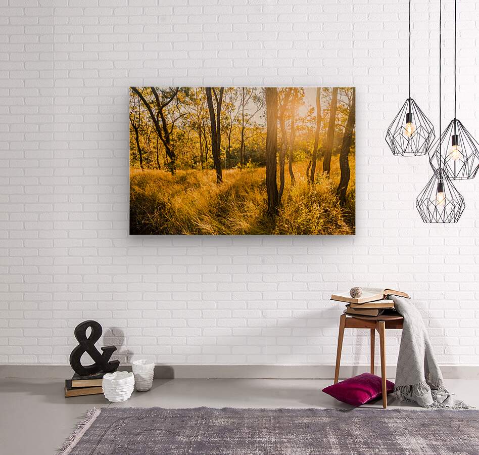 A golden grove of scrubby trees and distant woods bathed in sunlit serenity of late afternoon light. Mt Perry Queensland Australia