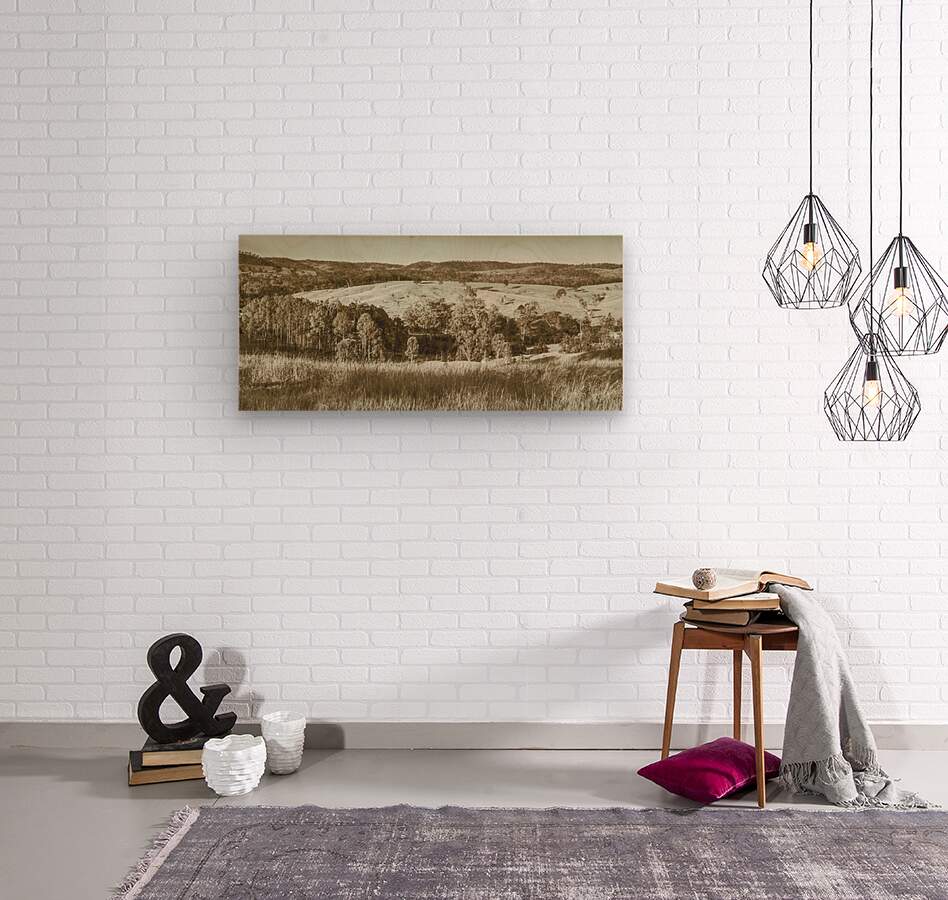 A horizontal panorama photograph of grasslands before pristine farming country tinged in colours of the old bygone. Mungy Queensland Australia