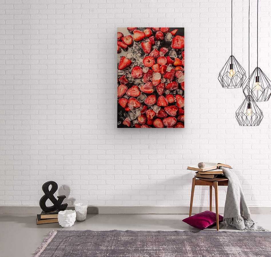 Vertical photography on a spread of icy cold strawberry snacks contrasted on a cocktail bar of black deliciousness