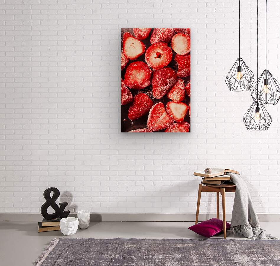 Vivid red strawberries sparkle with frost glistening in the light. They await to be blended into smoothies or enjoyed as a refreshing snack on a warm day